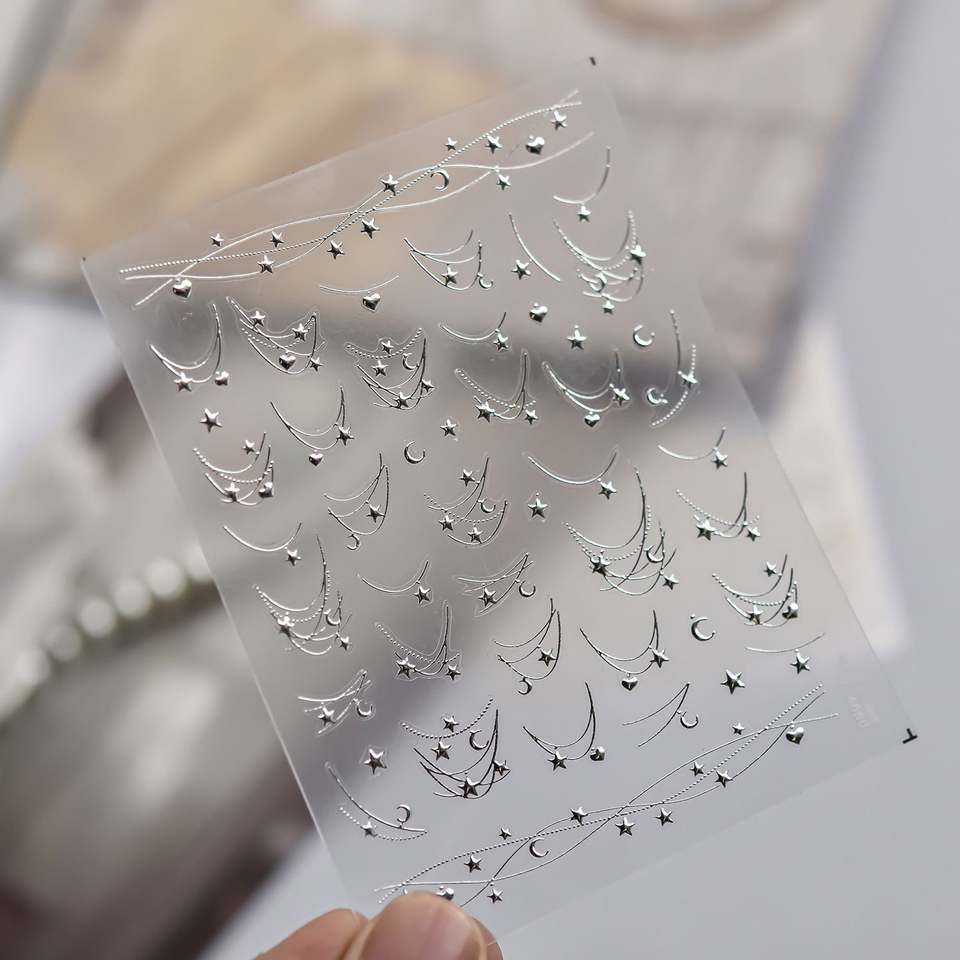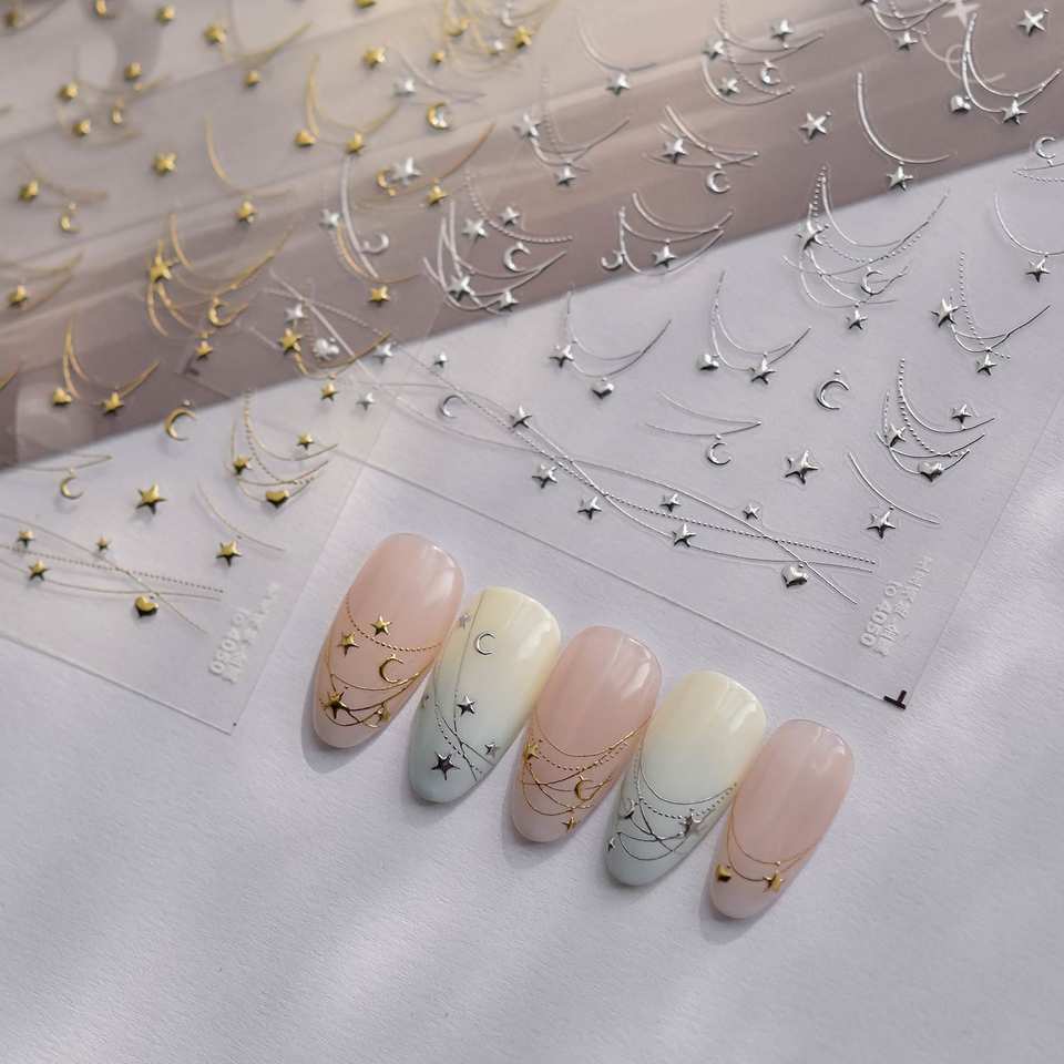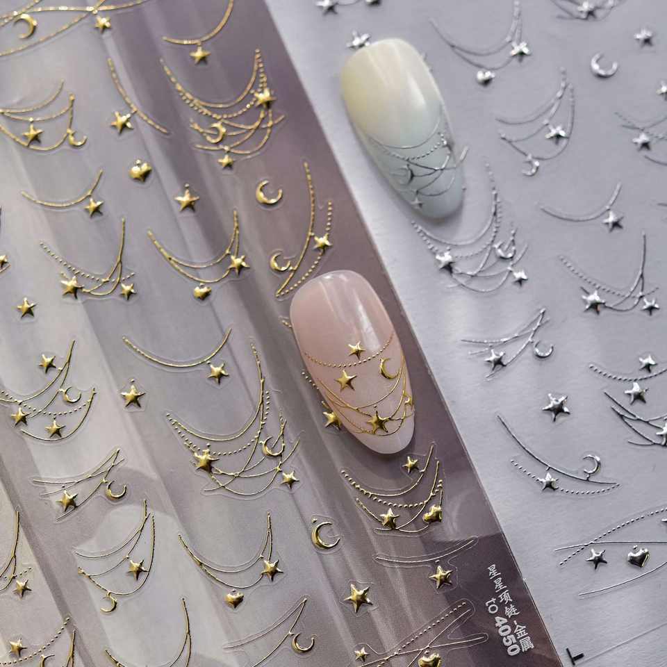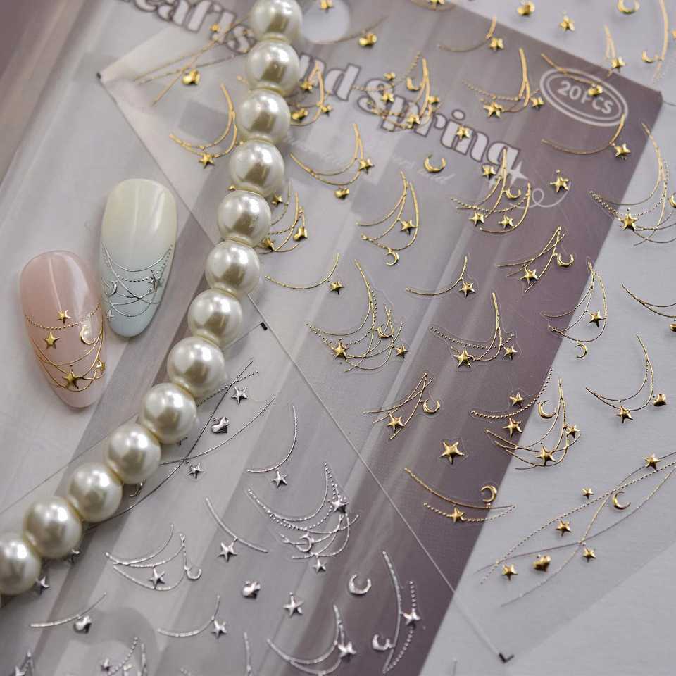 Autocollants pour ongles en forme de cœur, de lune et d'étoile en or et argent 5D, paillettes, perles, autocollants pour ongles en gel scintillants, chaîne d'étoiles