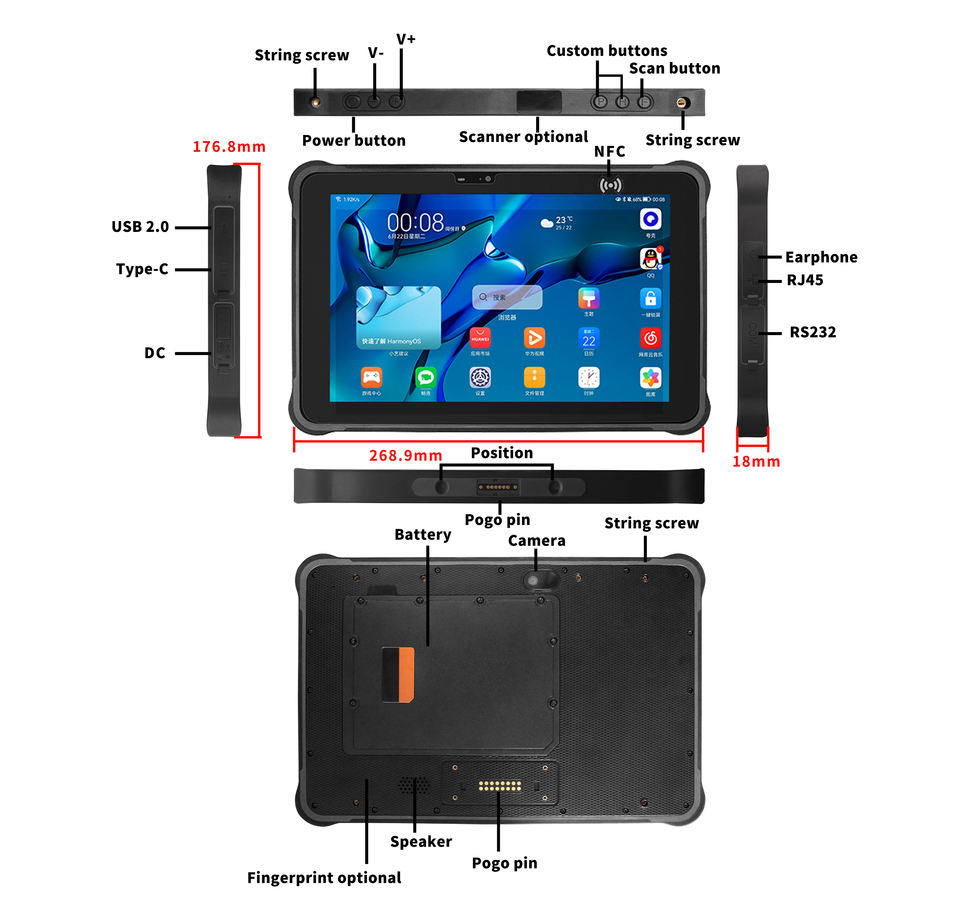 Tablette robuste Android 15 5G 10,1 pouces Haute luminosité 800 nits lisible en plein soleil 12000 mAh Indice IP67 RFID UHF en option pour l'extérieur