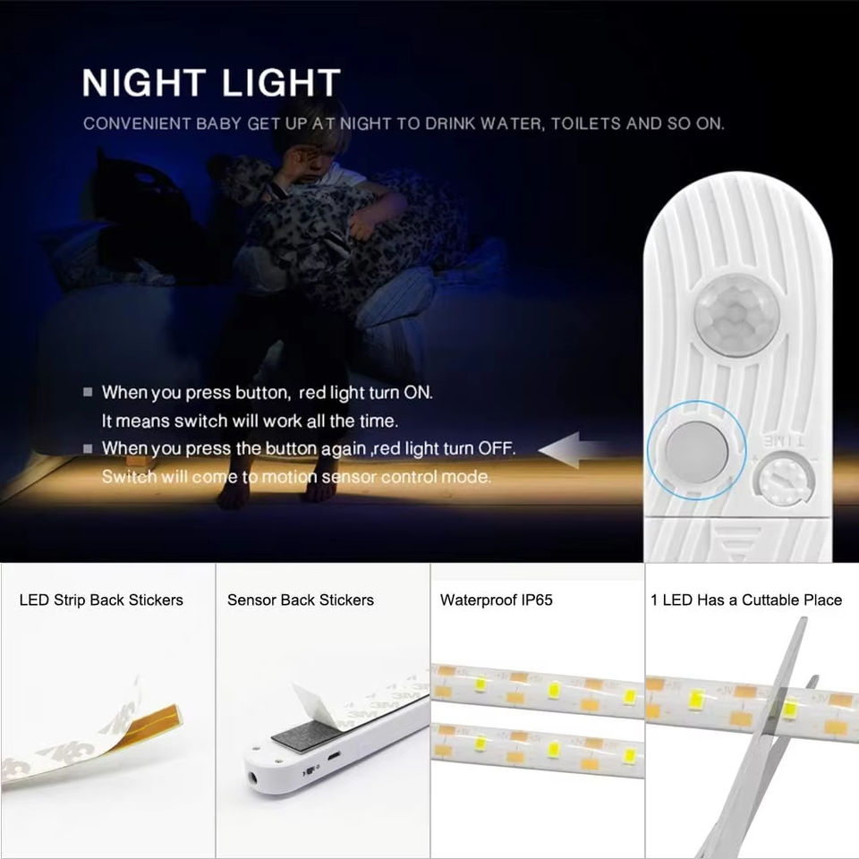 Bande LED de 5 m avec capteur de mouvement PIR, lumière de nuit à induction, ruban lumineux sous l'armoire, éclairage intérieur pour chambre et placard