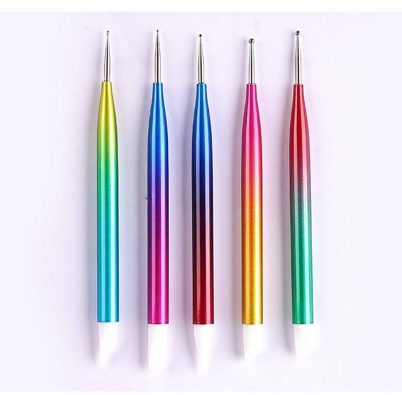 Ensemble de 5 applicateurs à ongles en silicone à pointe plate avec manche en métal dégradé, pinceau à ongles double face, ensemble de stylos à points en silicone pour nail art