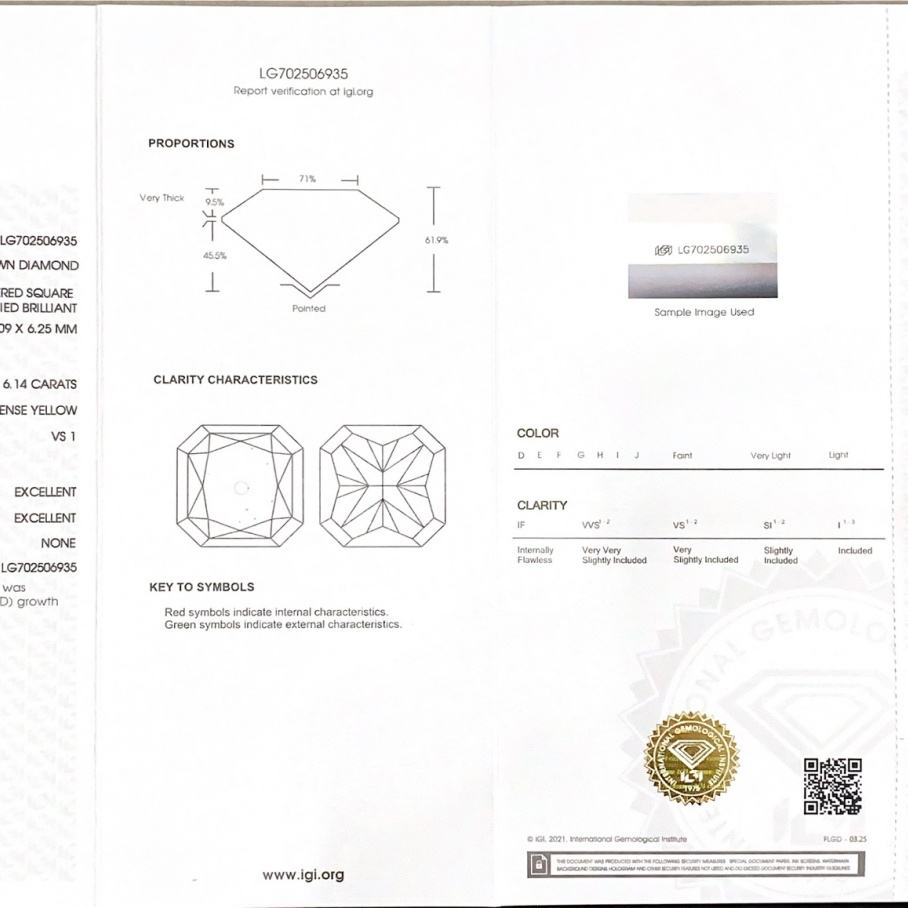 Diamant de laboratoire cultivé CVD de 6,14 carats, VS1, jaune intense fantaisie, taille radiant, certifié IGI, style tendance, diamants en vrac