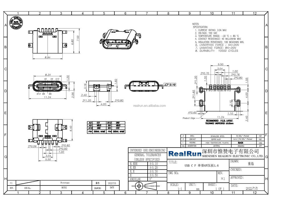 Connecteur USB femelle type-c 6 16 broches SMT encastré pour port de charge de téléphone portable en laiton en acier inoxydable PCB prise Usb type C
