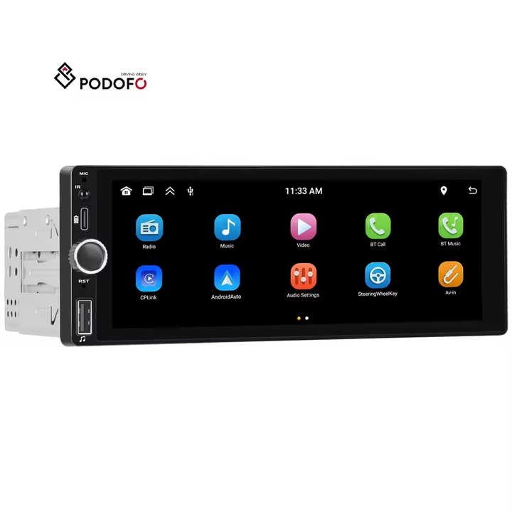 Autoradio IPS 6,86 pouces Podofo 1 Din, CarPlay sans fil, Android Auto, MP5, Bluetooth, FM, RDS, rétroéclairage coloré, interface Type-C
