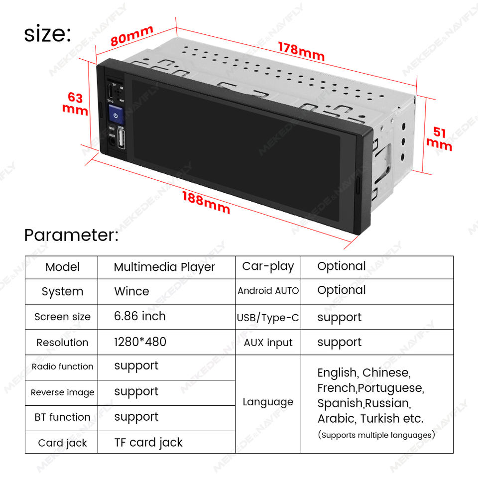 Autoradio USB AUX 6,86 pouces, type universel, prise en charge du CarPlay sans fil, système Android, écran tactile, lecteur DVD de voiture 1DIN, MP5, MP3