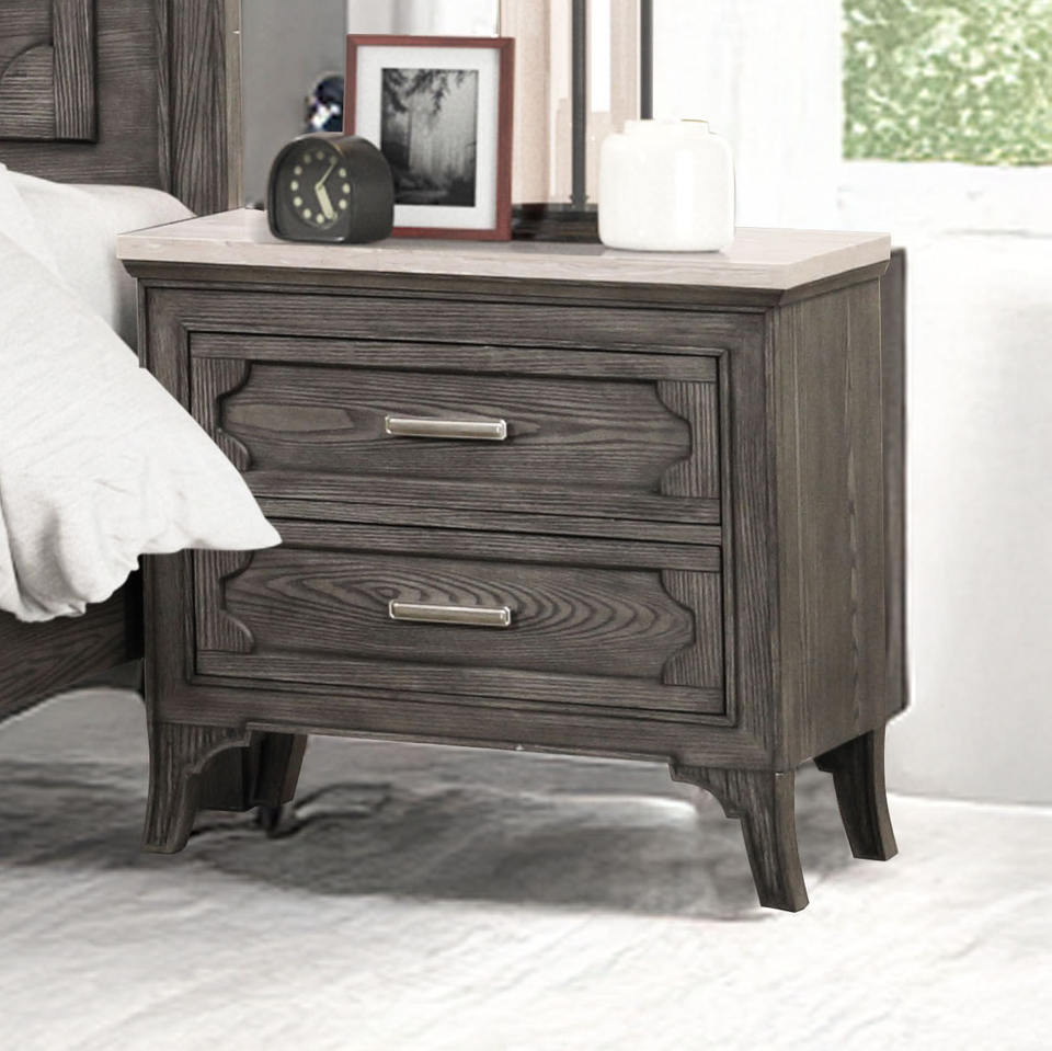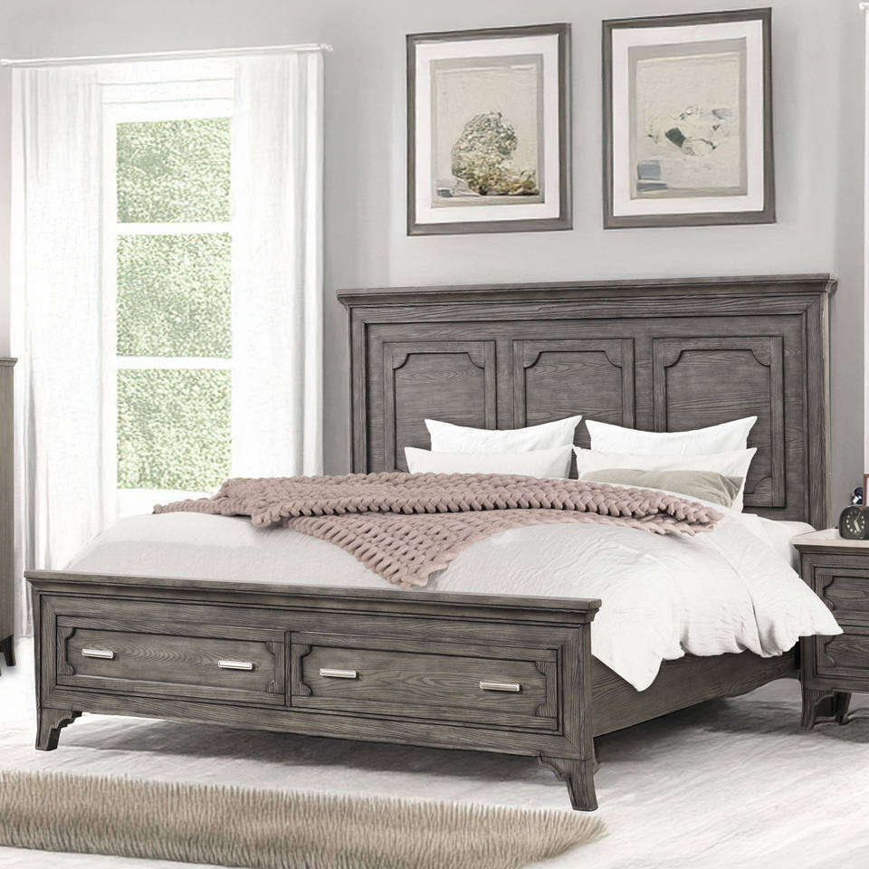 Commode grise moderne de style transitionnel pour chambre à coucher, à 6 tiroirs, avec poignée métallique et panneau superposé