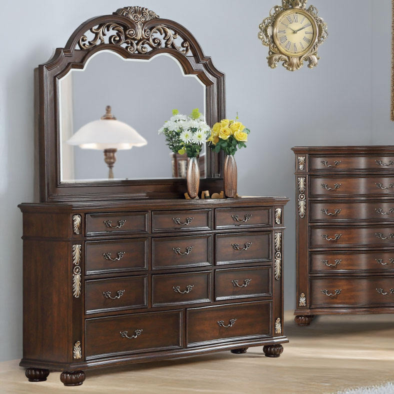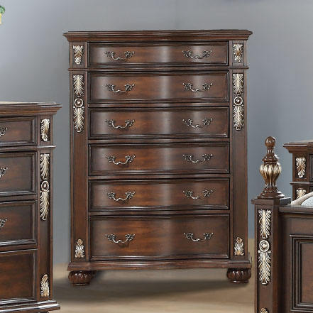 Commode de rangement traditionnelle antique en bois foncé à 6 tiroirs, avec poignée à motif festonné ornée et finition dorée, et pieds en forme de boule, pour chambre à coucher