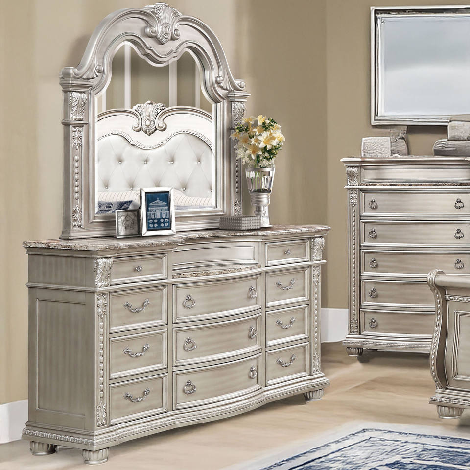 Commode de rangement pour chambre à coucher à 6 tiroirs et poignée à anneau, avec garniture sculptée et pieds en forme de boule, argent glamour antique
