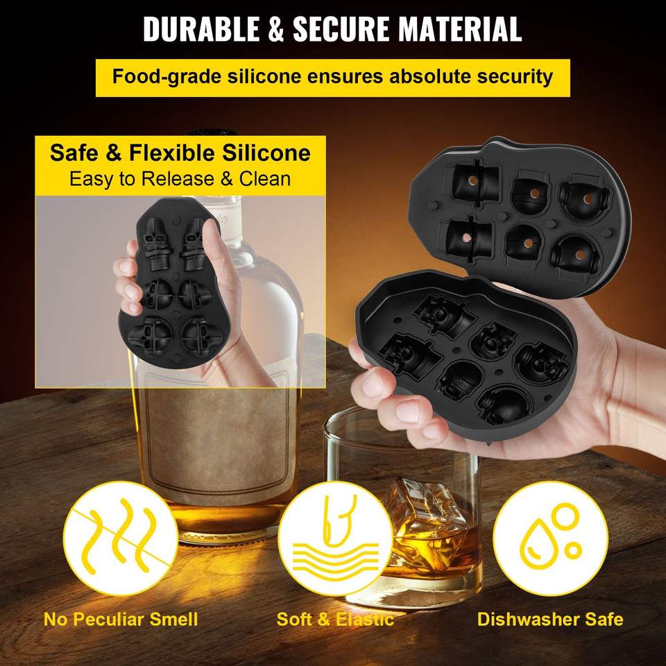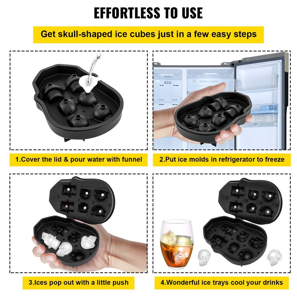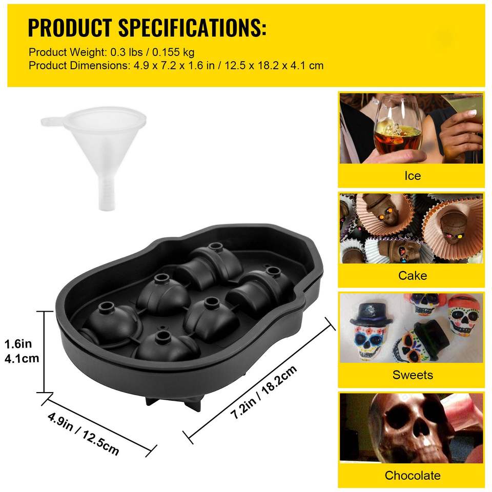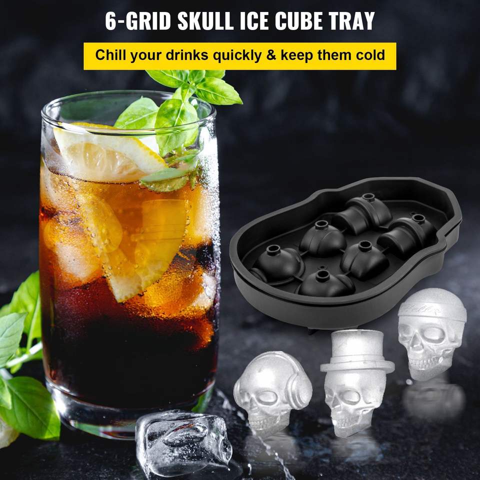 Bac à glaçons en silicone noir flexible à 6 cavités en forme de crâne, avec entonnoir, design unique inspiré d'Halloween, imprimé en 3D