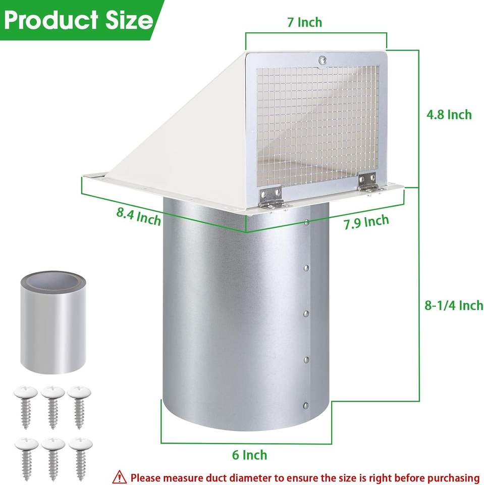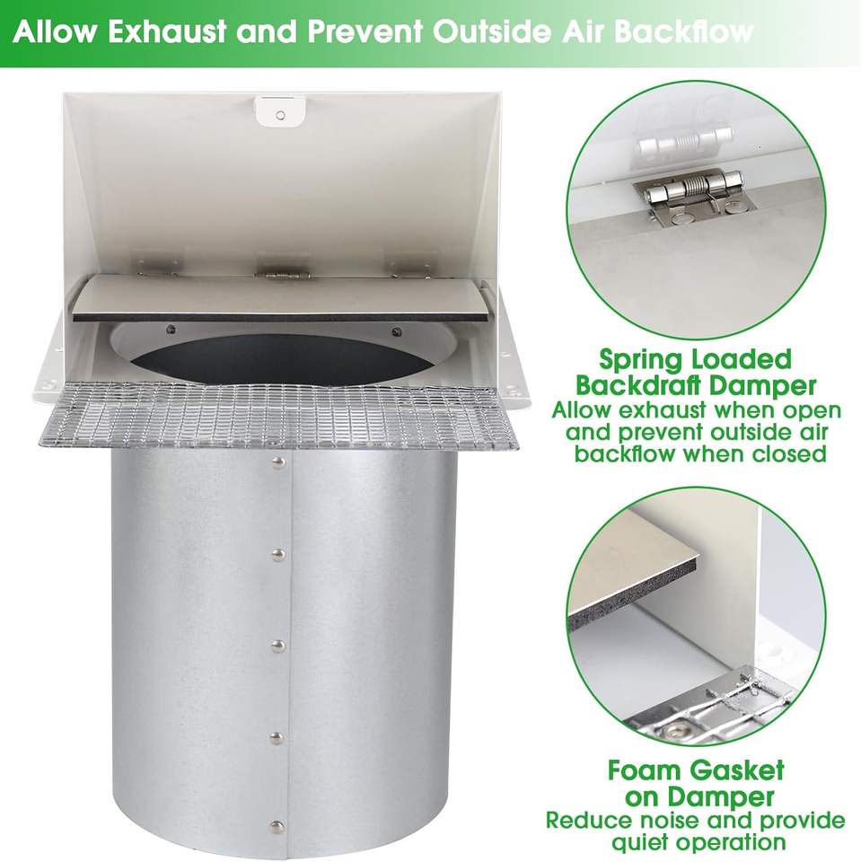 Grille d'aération murale à capot de 6 pouces en acier galvanisé blanc pour cuisine extérieure et ventilation de sèche-linge, cache d'évacuation mural