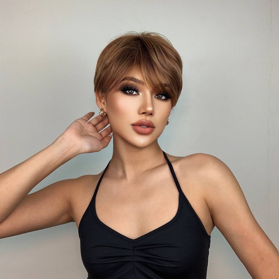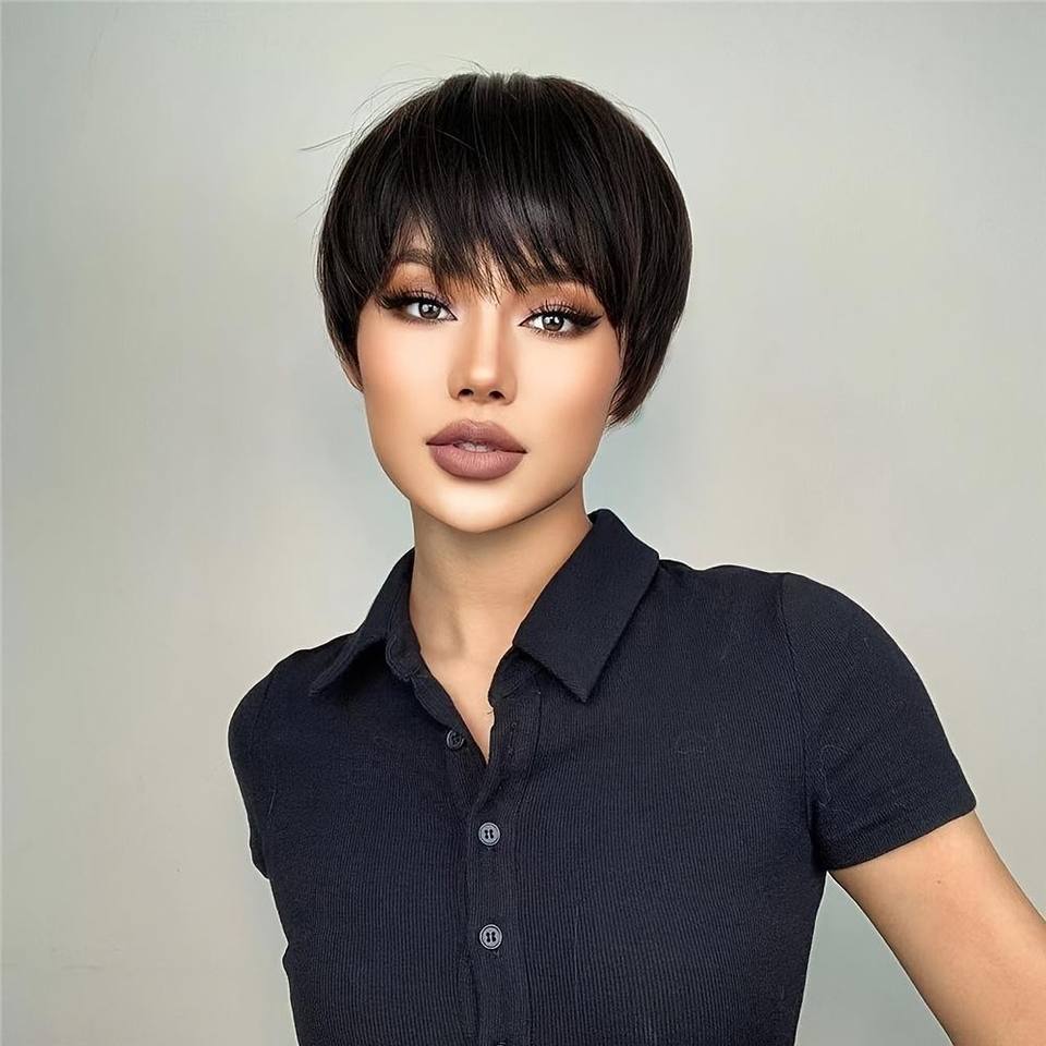 6 pouces court couches Pixie coupe de cheveux perruque de cheveux raides avec frange noir brun frange sans colle pas de dentelle perruque de mode pour les femmes dame