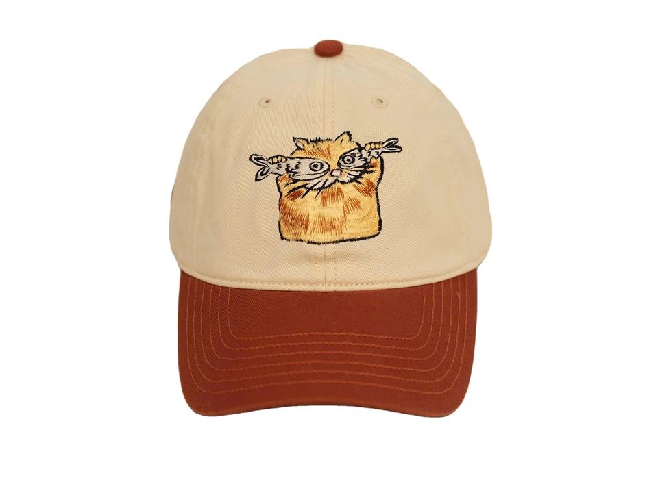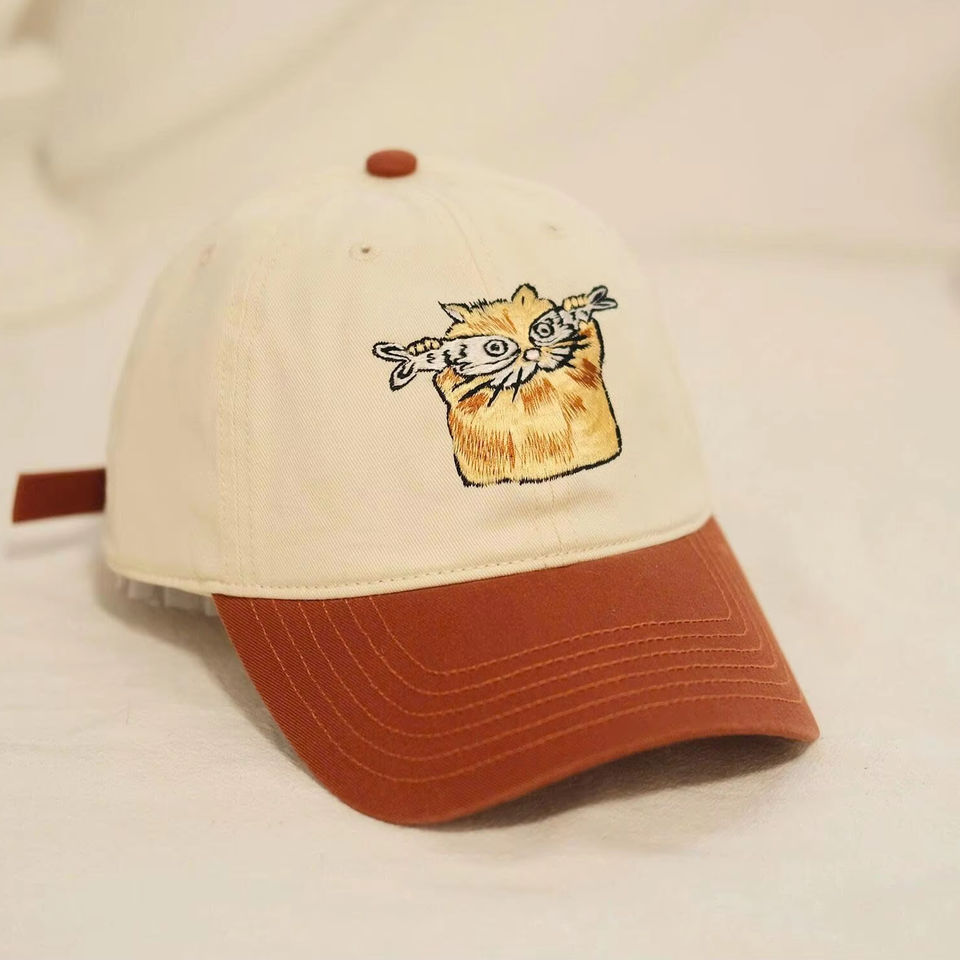 Casquettes en coton brun crème à 6 panneaux brodées pour chat graphique tenant une branche image sportive pour le camping décontracté Vietnam vente en gros