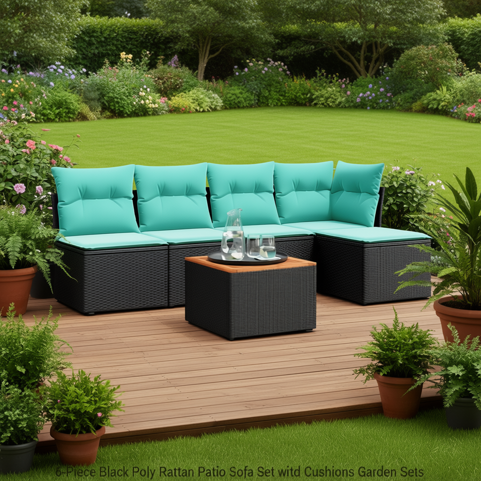 Ensemble de canapés de patio en polyrotin noir, 6 pièces, avec coussins, meubles de jardin d'extérieur
