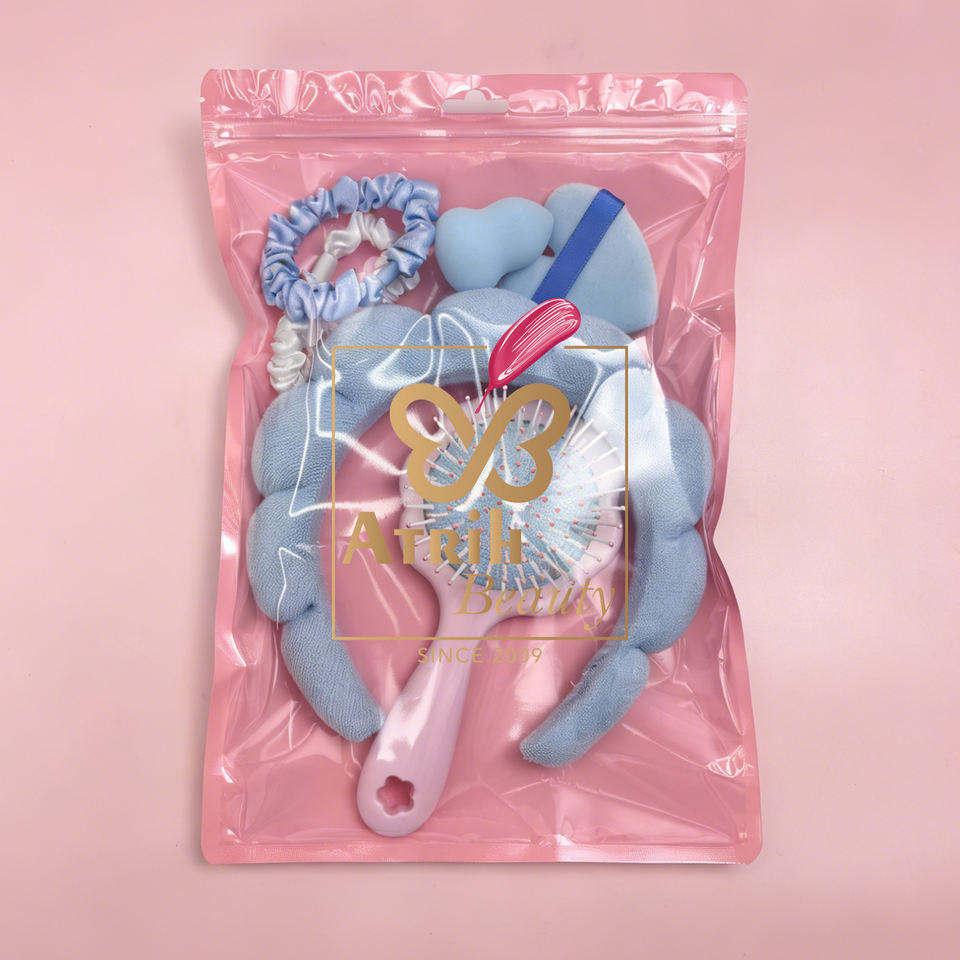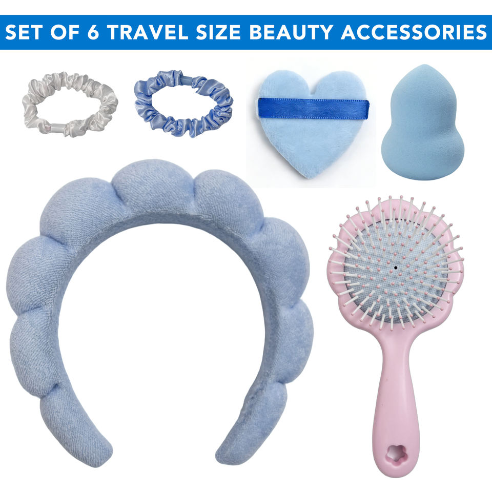 Ensemble beauté Nuage Bleu 6 pièces : Bandeau de spa, Brosse démêlante, Chouchous en satin, Houppette en forme de cœur, Éponge de maquillage en forme de gourde