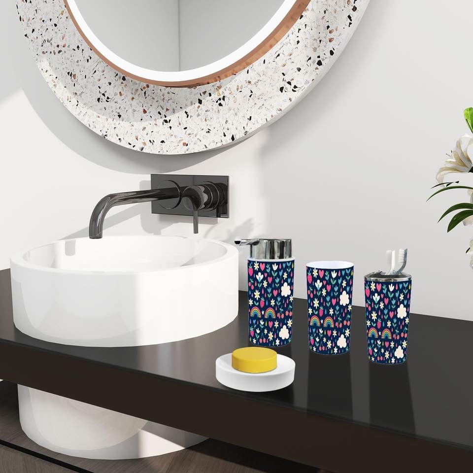Ensemble de 6 pièces Boho mignon matériel de bain dessiné à la main fruits floraux arc-en-ciel nuage sans couture motif Nickel pour la maison accessoire de salle de bain