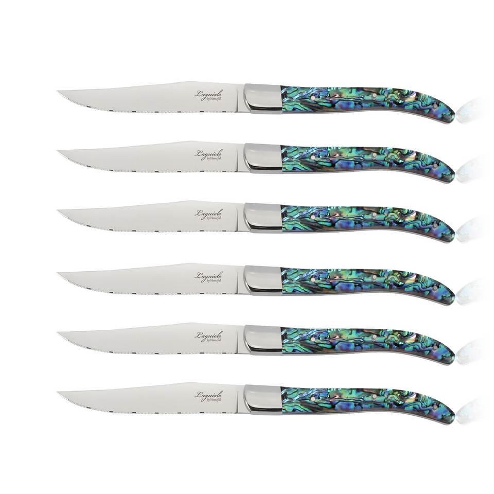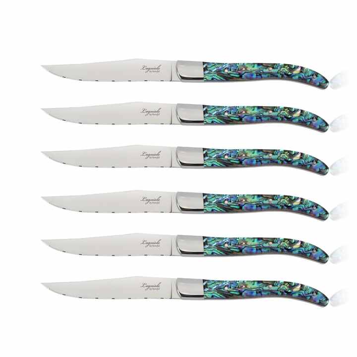 Ensemble de 6 couteaux à steak Laguiole dentelés et tranchants de 5 pouces en acier inoxydable, manche en véritable nacre, ambidextre, pour restaurant