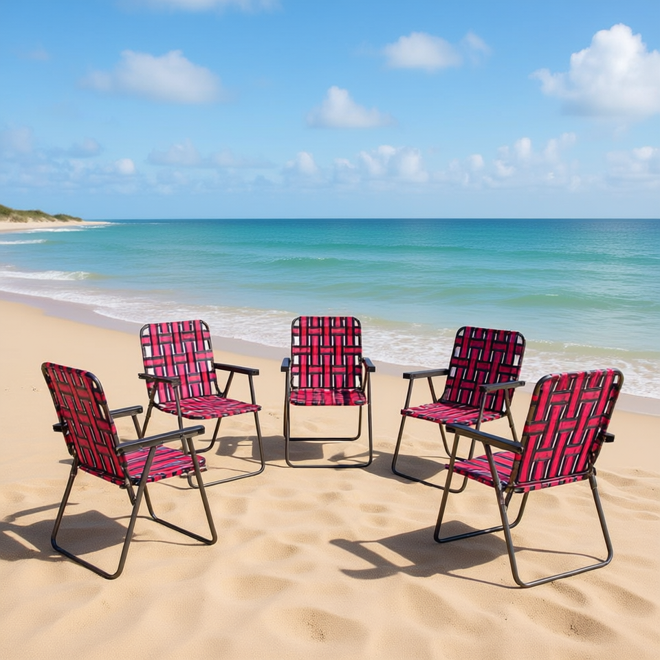 Chaise de plage pliable avec cadre en acier et sangle en toile rouge, pour le camping en plein air et la pelouse