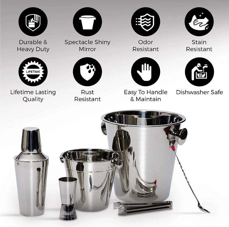 6 pièces en acier inoxydable Barware Set Double Jigger Pinces à glace Seau à vin Design industriel Capacité de 750ml Durable Perfect Fun