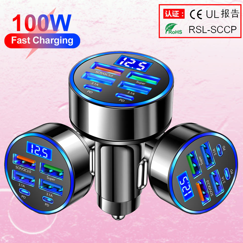 Chargeur de voiture 6 ports 4 USB + 2 PD avec affichage de la tension LED, adaptateur de charge rapide QC3.0 SCP 6 en 1 pour voitures 12V/24V