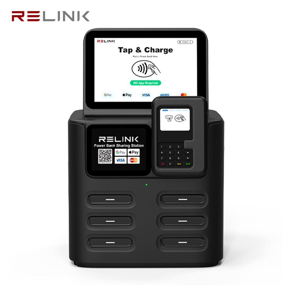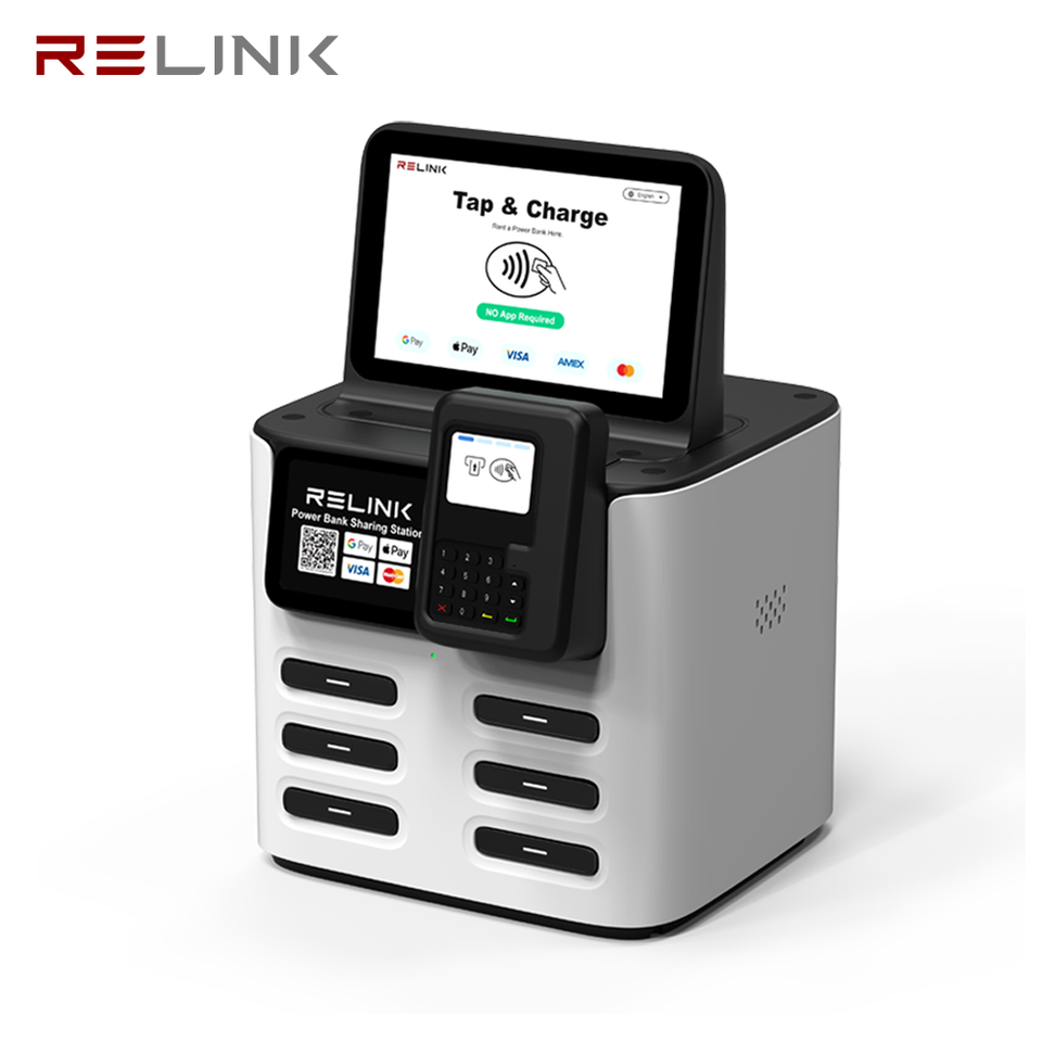 Kiosque de location de batteries externes à 6 emplacements, charge rapide Type-C 40W, station de recharge pour téléphones portables avec écran publicitaire 8 pouces pour les entreprises