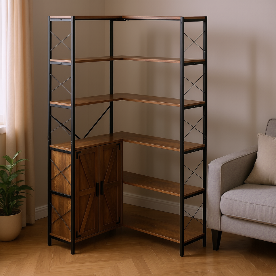 Étagère d'angle à 6 niveaux avec portes, bibliothèque haute en forme de L, meuble de salon moderne style ferme, étagère en métal