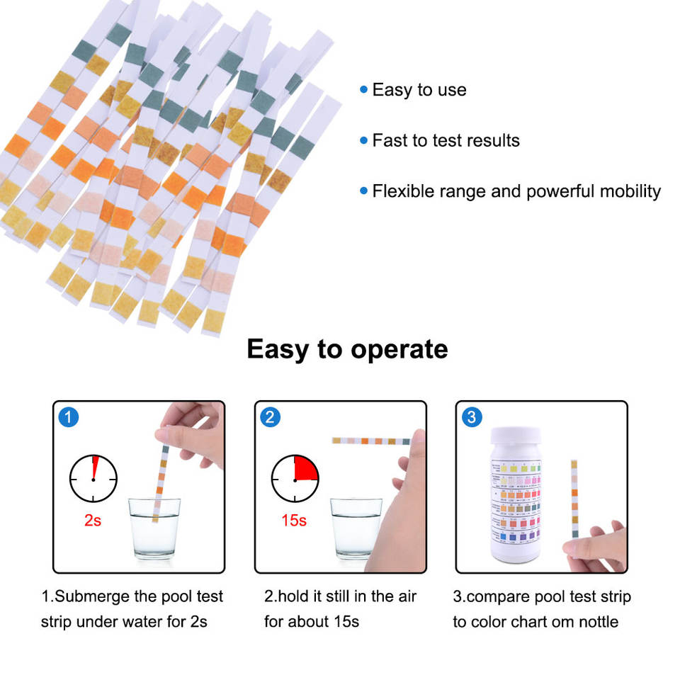 Bandelettes de test d'eau multi-paramètres 6-en-1 : chlore total, pH, alcalinité, acide cyanurique, dureté – 50 bandelettes par flacon