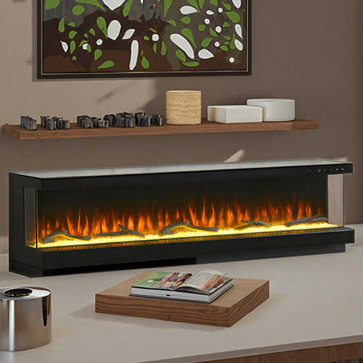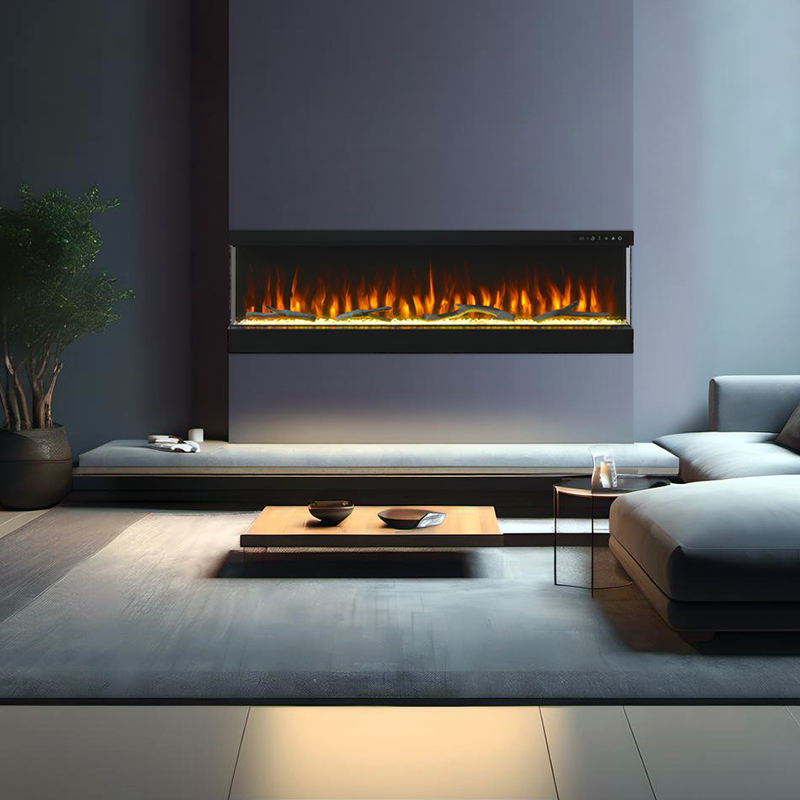 Cheminée électrique moderne à 3 faces de 60 pouces avec bûche en acier et garniture en cristal pour une utilisation intérieure pour les hôtels