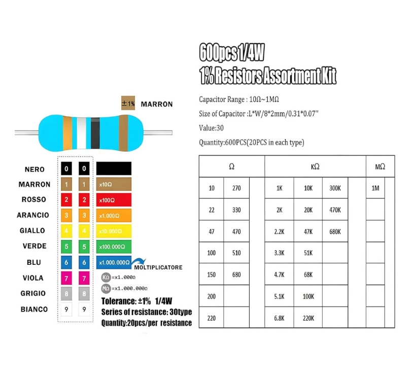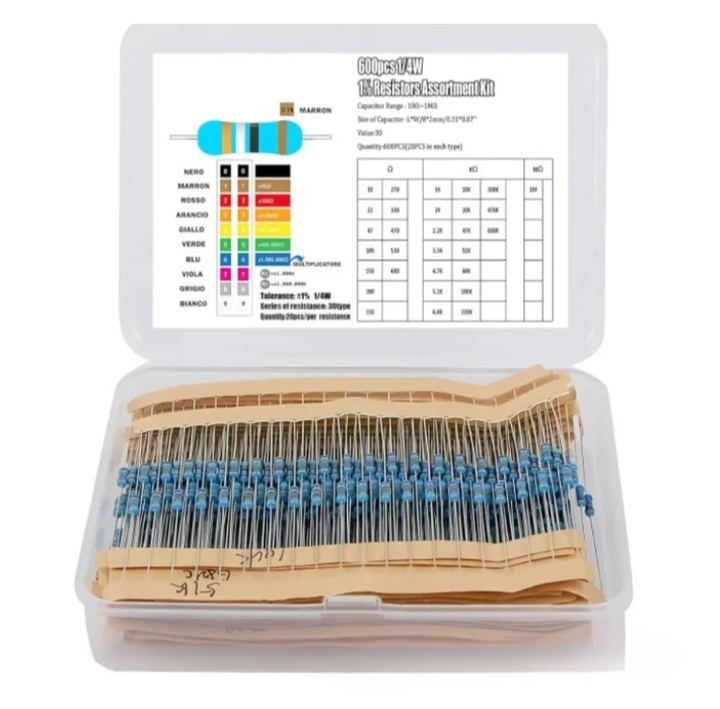 Kit de résistances à film métallique 600 pièces 1/4W - Précision 1% 10R-1M Résistance (30 valeurs 20 pièces chacune)