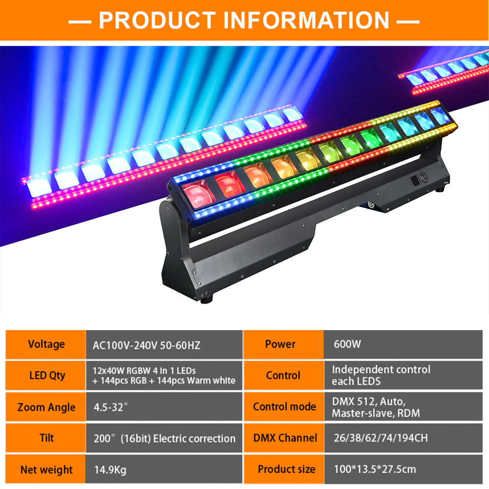 Barre de lumière LED mobile 600W à 12 têtes RGB 4-en-1 avec contrôle DMX, Lyre pour éclairage de scène en DJ, discothèque, club, avec émission RGBW