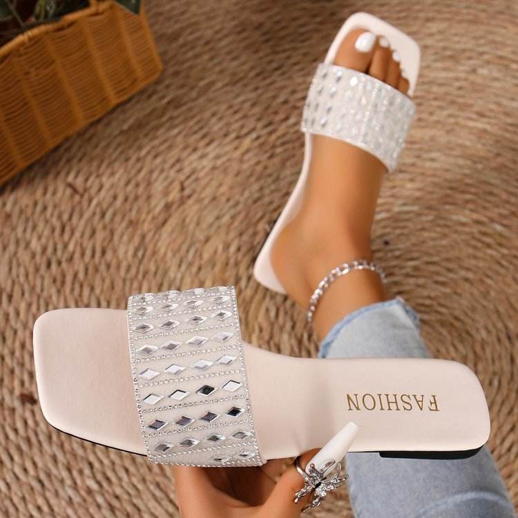 6030 New Small Fragrant Style Square Head Casual One Word Women's Shoes Large Size Color Diamond Flat Bottom Cool Slippers