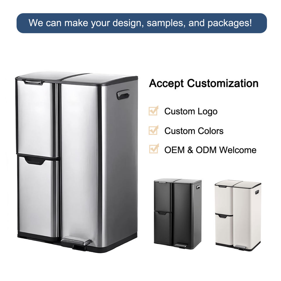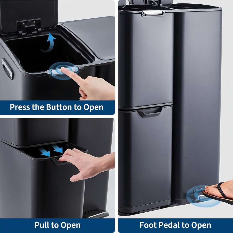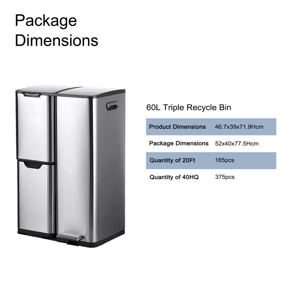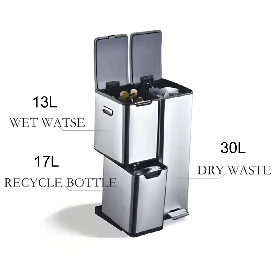 Poubelle de recyclage en acier inoxydable à 3 compartiments de 60 L avec pédale et bouton de pression sur le dessus, solution de recyclage écologique