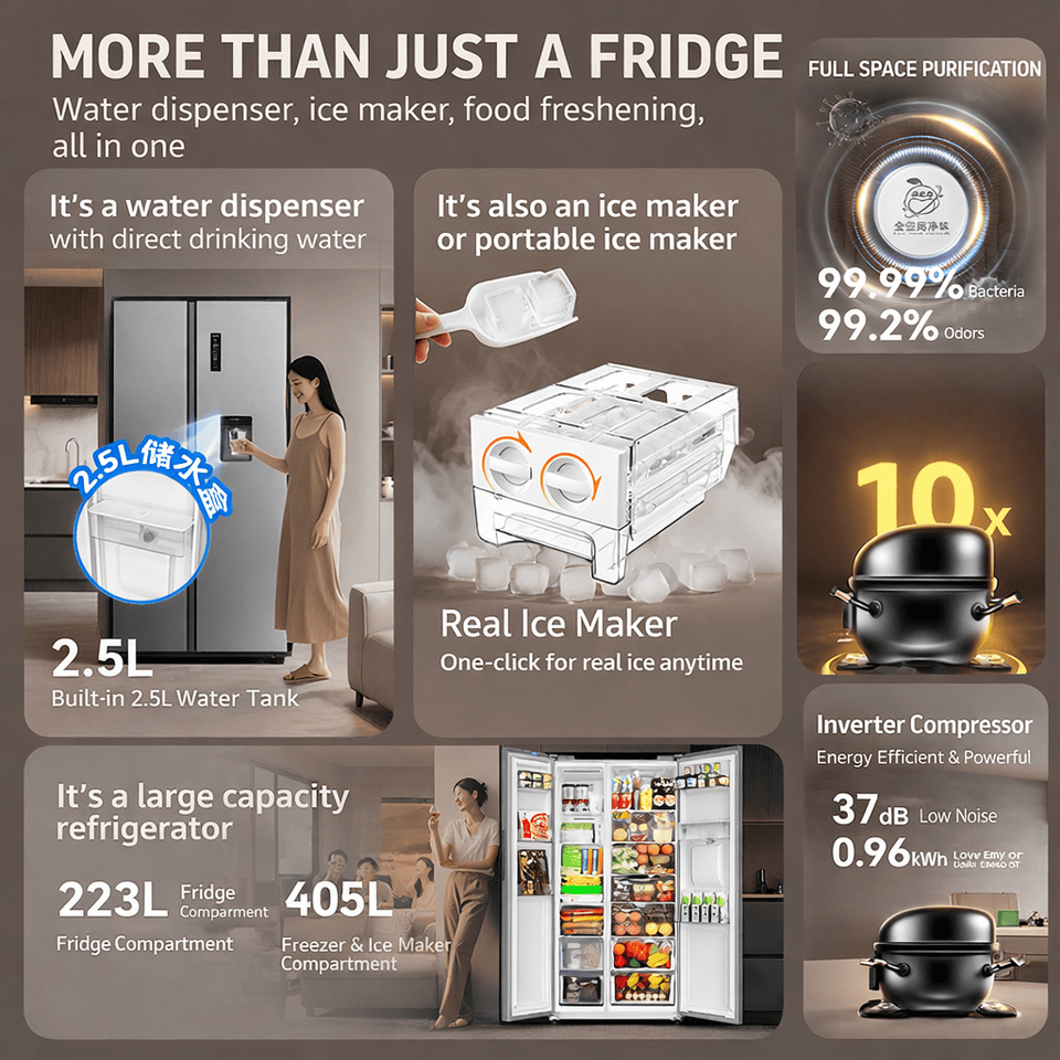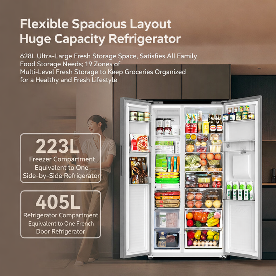 Réfrigérateur côte à côte 628L Inverter No Frost Double Porte Grande Capacité avec Distributeur d'Eau et Machine à Glaçons