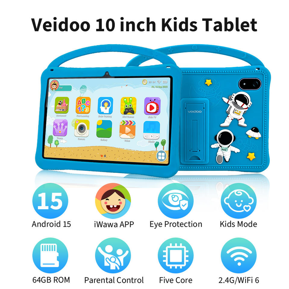 Tablette éducative pour enfants 10 pouces IPS anti-chute avec 64 Go de ROM, Android 15, Wi-Fi 6, contrôle parental et logiciel IWawa préinstallé
