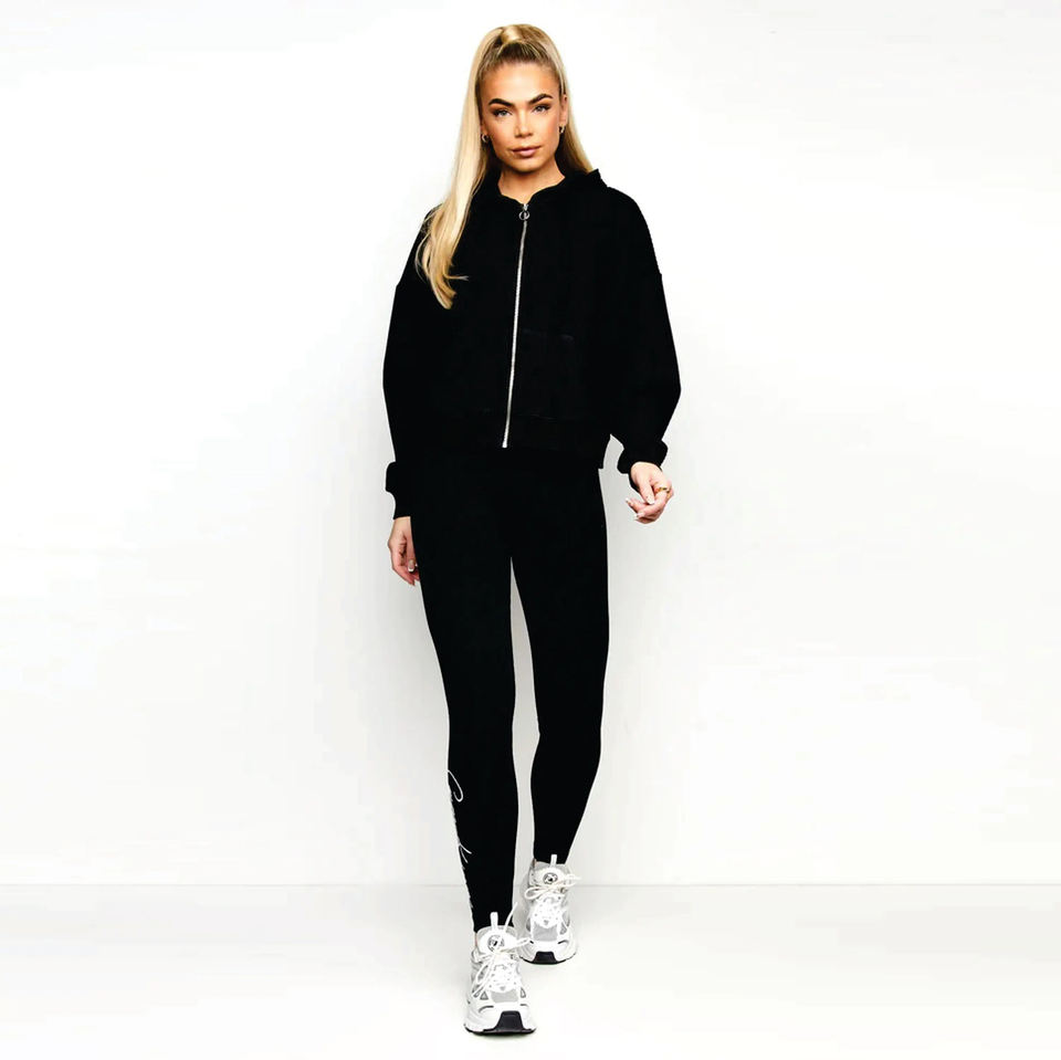 Custom Logo Womens Black Zip up Hooded Jacket and Leggings Set Casual Fitness Sportswear Outfit Two Piece Tracksuit