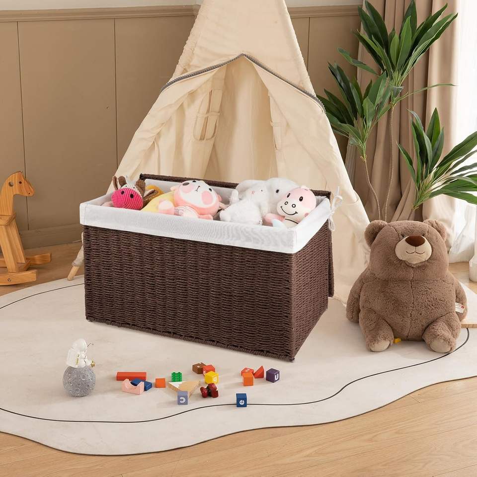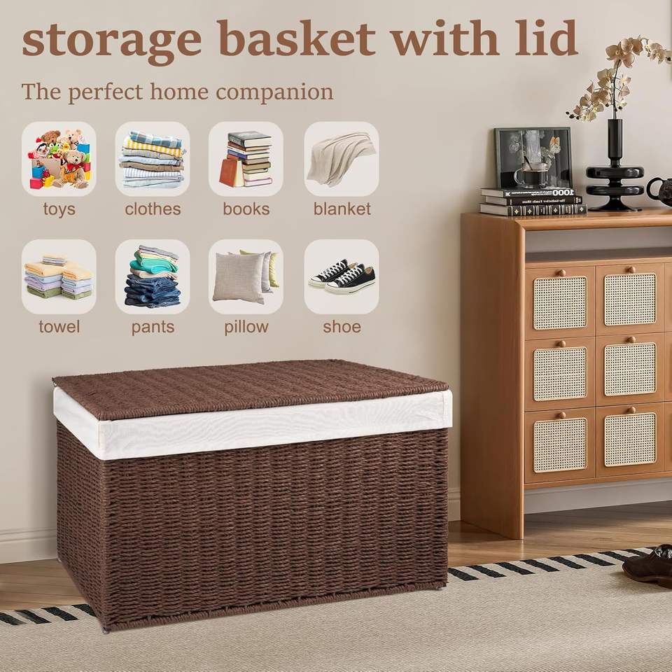 Panier de rangement pliable en corde de papier 65L-105L avec couvercle, panier à linge, panier à couvertures avec doublure amovible séparée