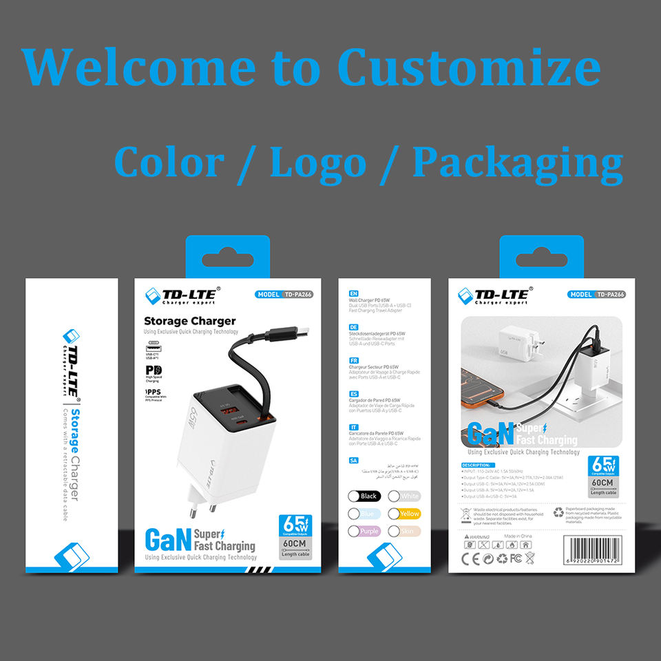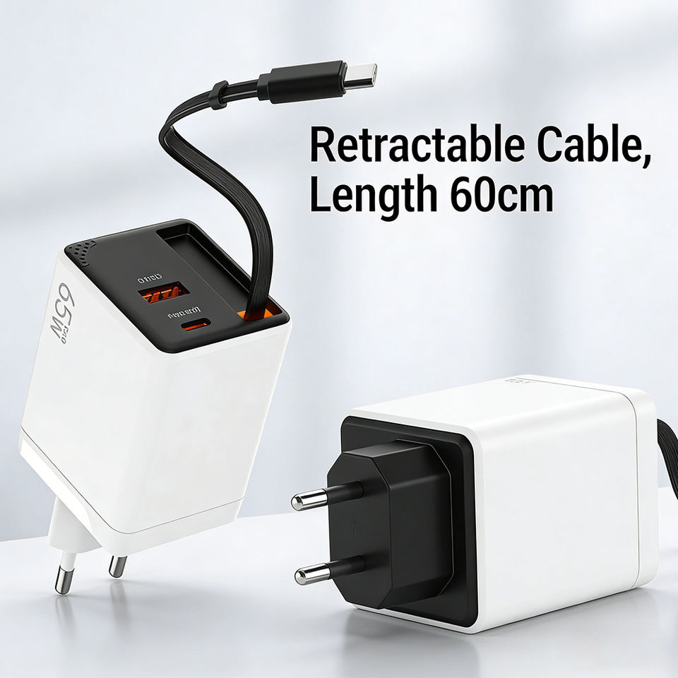 Chargeur rapide GaN 65W à 3 ports avec câble rétractable, chargeur mural portable PD QC 3.0 pour iPhone, ordinateur portable