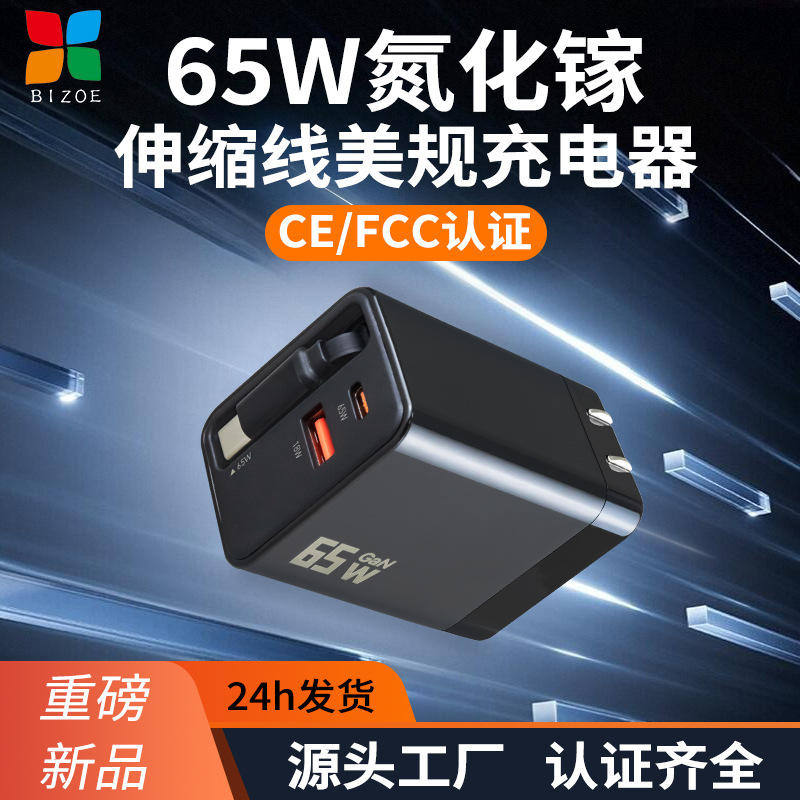 Chargeur en nitrure de gallium 65W avec câble rétractable Tête de charge rapide multi-ports adaptée à Apple Huawei Android Tablette pour ordinateur portable