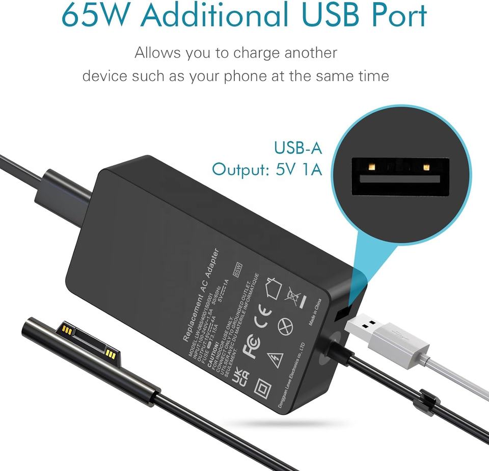 Adaptateur secteur 65W Surface Pro 15V 4A PD Chargeur avec port DC Compatible avec Microsoft Surface Pro Laptop 5/4 Surface Book 3