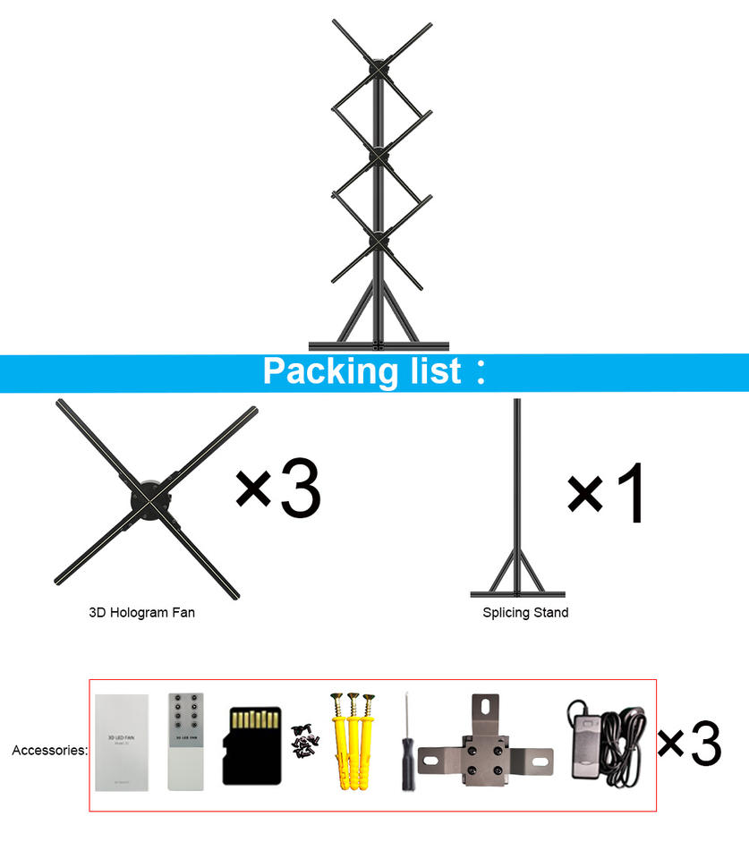 Ventilateur holographique 3D grand format 65 cm 1*3 avec support et étui, solution complète 2500 Nits 4K pour affichage mural vidéo par assemblage de ventilateurs holographiques