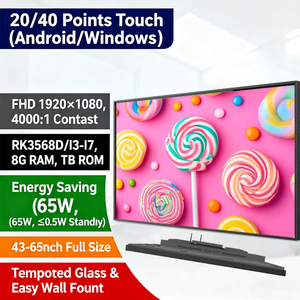 Lecteur vidéo 65 pouces 75 pouces, 20 points, Android Windows, kiosque publicitaire avec verre trempé de 4 mm pour centre commercial