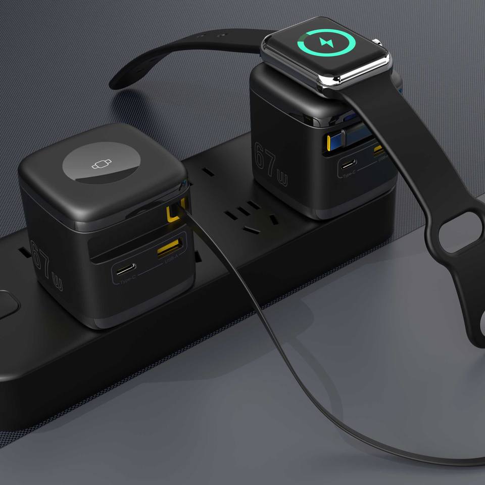 Charge rapide 67W avec câble rétractable intégré et charge sans fil – Chargeur USB-C PD multi-ports