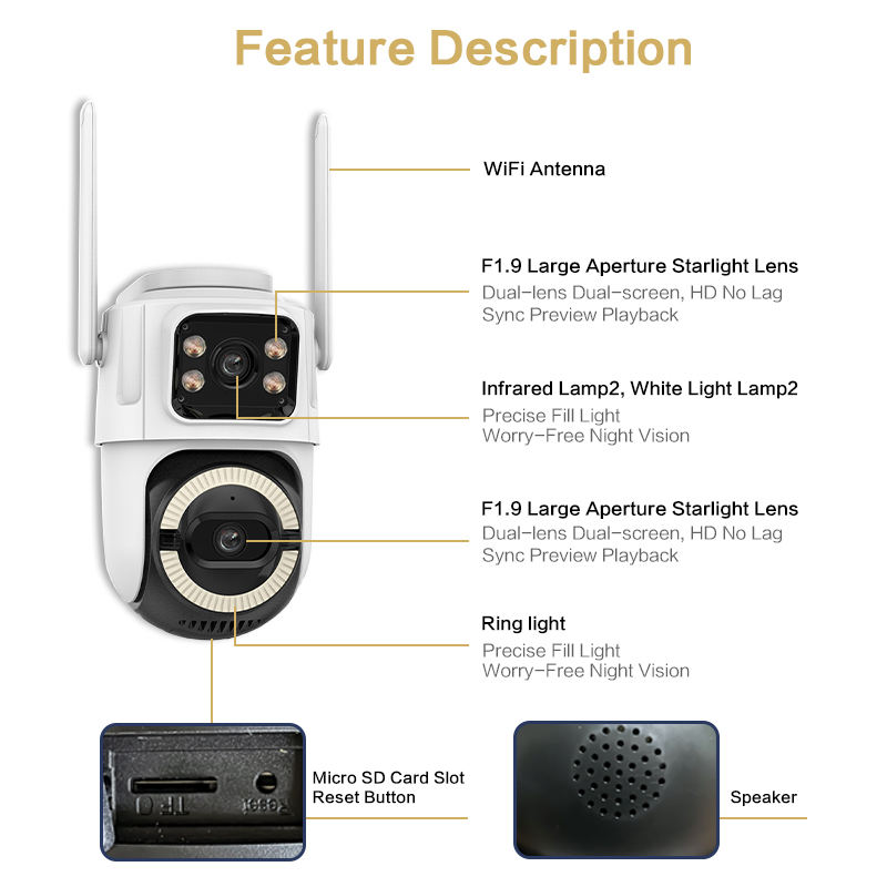 Fonction:Micro intégré, Vision nocturne, PAN-TILT, RESET, Audio bidirectionnel, Imperméabilisez/protégez contre les intempéries, Grand Angle