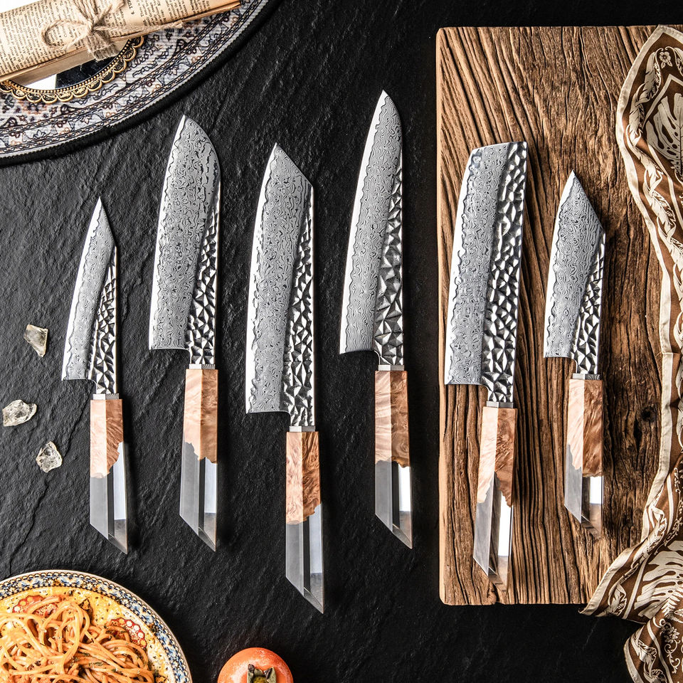Ensemble de 6 couteaux de cuisine japonais en acier Damas AUS10 à 67 couches, manche en bois stabilisé et résine