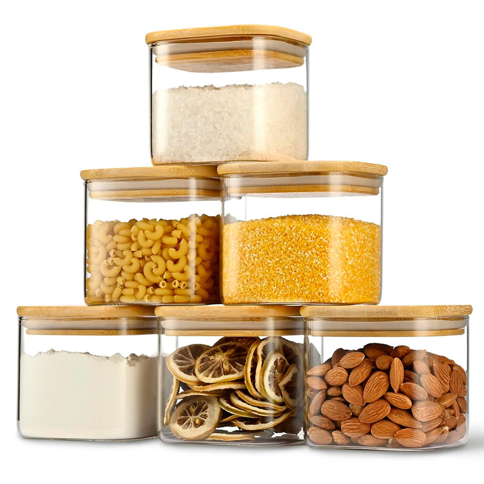 6 pièces carré haute Borosilicate 600ML cuisine confiture Longan Grain noix bonbons épices stockage bocaux en verre ensemble avec couvercle en bambou grand