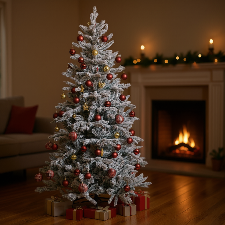 Sapin de Noël artificiel floqué de 1,80 m avec décorations rouges et dorées pour décorations de vacances d'intérieur