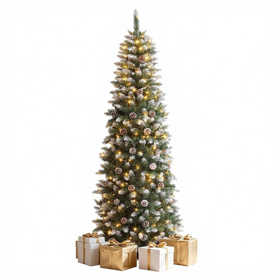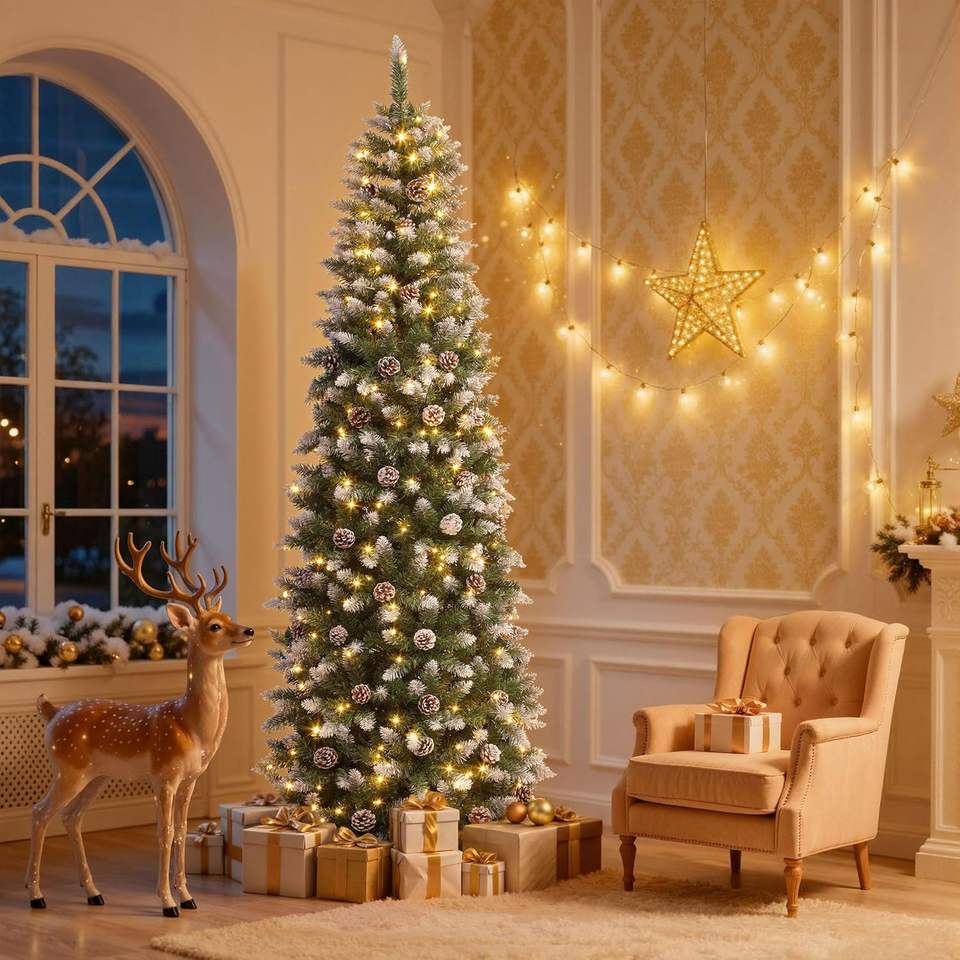Sapin de Noël artificiel pré-éclairé de 1,80 m, fin, légèrement enneigé, type sapin Kingswood, avec 50 cônes de pin, pour la maison et les fêtes