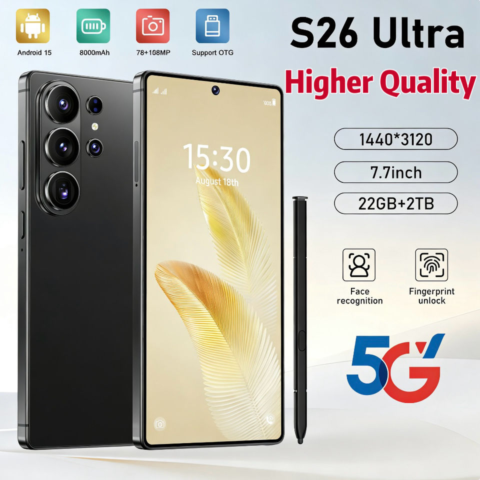 Smartphone 5G Android 15 S26 Ultra 7,7 pouces 22 Go + 2 To, performances de jeu fluides, débloqué, directement d'usine, pour joueurs et commandes en gros
