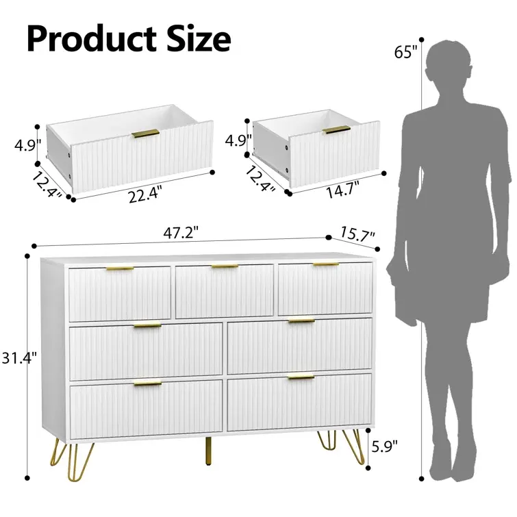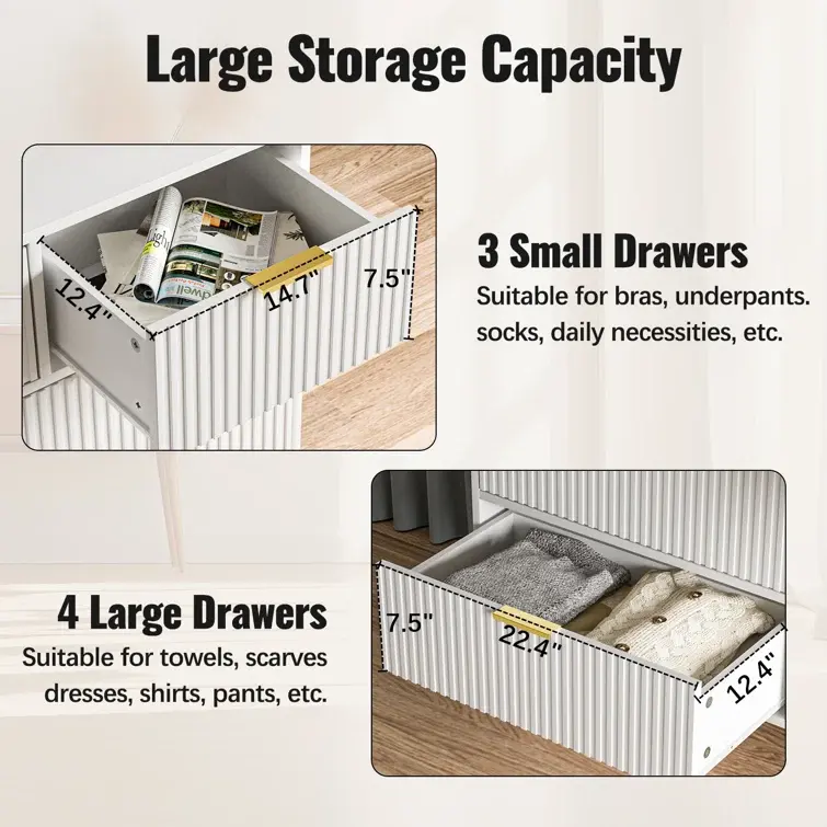 Commode à 7 tiroirs avec 4 grands tiroirs et 3 tiroirs moyens, stable et robuste, pour la chambre à coucher