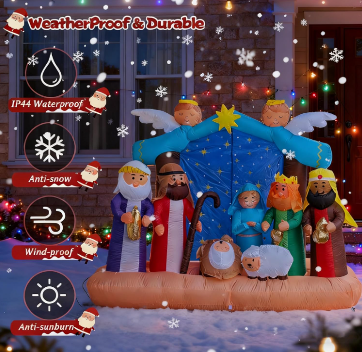 Crèche de Noël gonflable de 7 pieds avec lumières LED, ensemble de crèche comprenant la Sainte Famille, les Trois Rois Mages, un ange et un berger