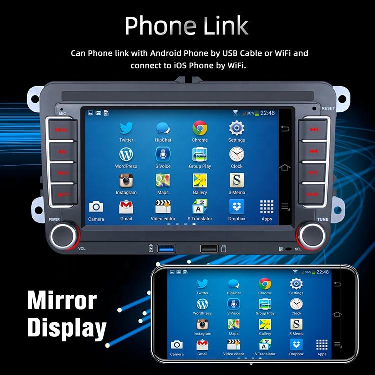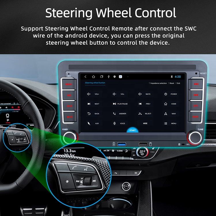 GPS, Stéréo, SANS MAINS, RVB, Lien de miroir, Image dans l'image, Microphone intégré, Écran partagé, Gestionnaire de fichiers, Volant de voiture de ContrôleFonction