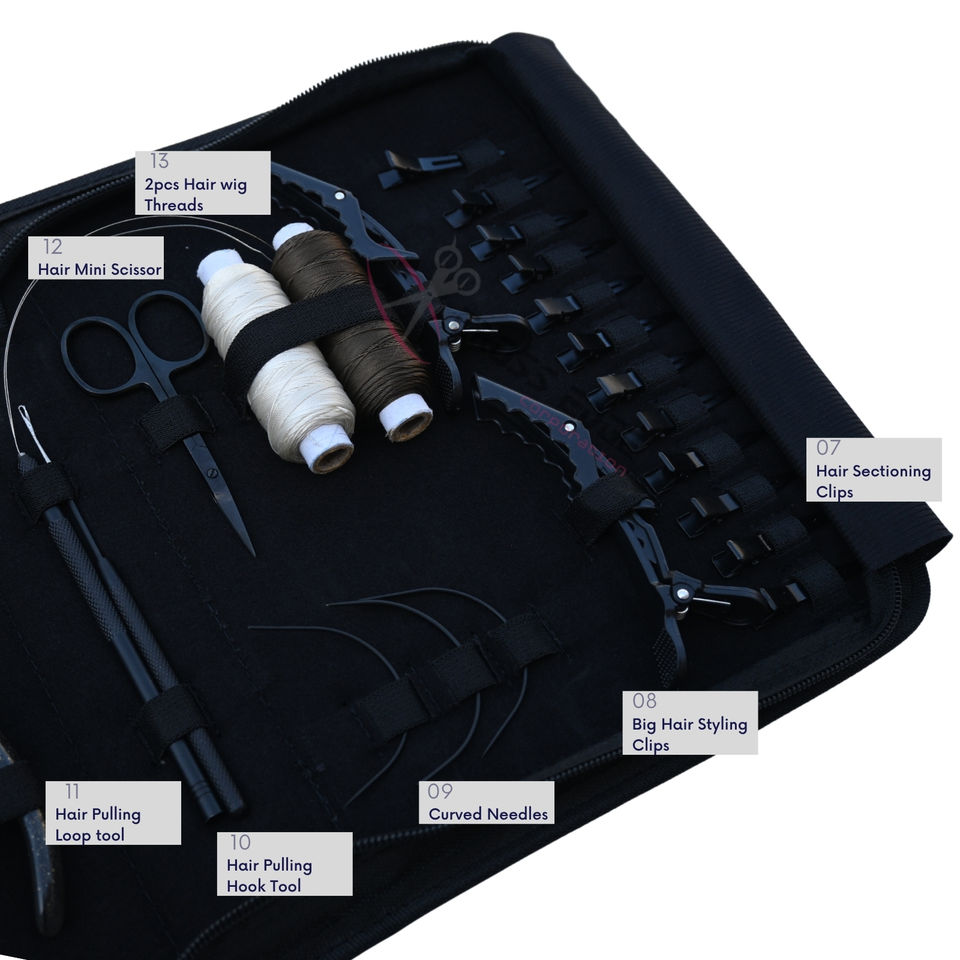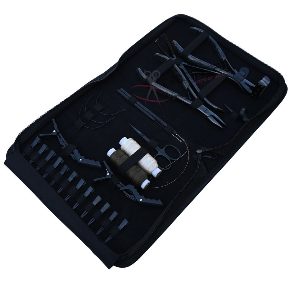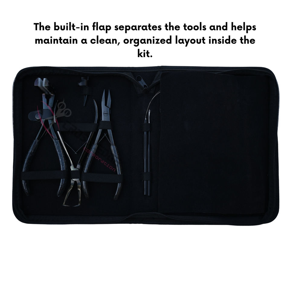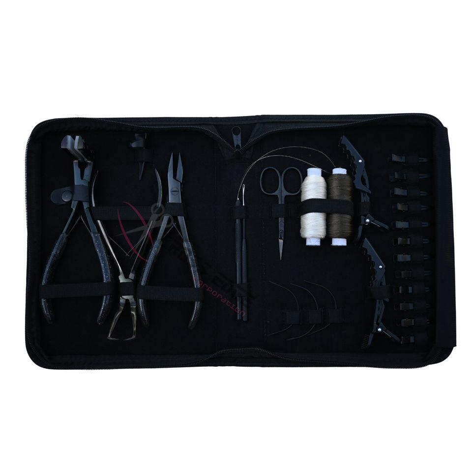MOQ:1 étui d'outils pour extensions de cheveux noirs, comprenant une pince à crêper plate de 7 pouces.